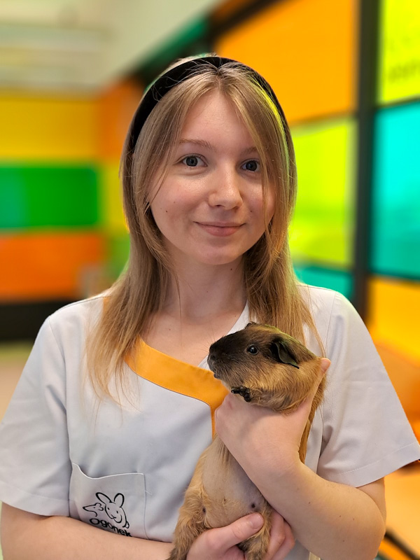 Skończyła warszawską SGGW w 2025 roku. Jej kariera u nas zaczęła się w 2023 roku - odbywała wtedy praktyki wakacyjne, po których została u nas jako asystentka lekarza weterynarii. Jej serce skradły głównie szynszyle i kawie domowe, ale innym gatunkom też okazuje dużo ciepła, uwagi i troski. Starannie opiekuje się szpitalnymi pacjentami i podpatruje pracę naszych doświadczonych lekarzy w akcji by coraz sprawniej przyjmować ogonkowych pacjentów. Zafascynowana nietypowymi przypadkami, uwielbia znajdować przyczynę skomplikowanych schorzeń.