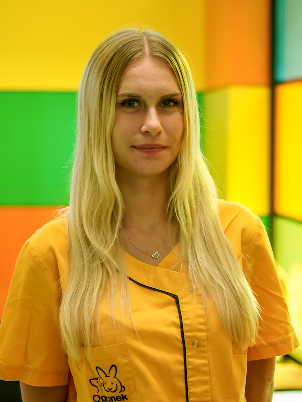 Absolwentka Wydziału Medycyny Weterynaryjnej Uniwersytetu Warmińsko-Mazurskiego w Olsztynie z 2024 r. W trakcie studiów zainteresowała się medycyną zwierząt egzotycznych, wybierała miejsca praktyk tak, by intensywniej poznawać te zwierzęta. Zaraz po uzyskaniu tytułu lekarza weterynarii dołączyła do zespołu Ogonka i najpierw jako technik, zaczęła uczyć się małych ssaków. Jako asystentka a teraz samodzielna lekarka, bez ustanku się doszkala uczestnicząc w kursach i konferencjach. Ciągle uśmiechnięta, ujmująco miła i empatyczna, potrafiąca docenić zaangażowanie opiekunów w proces leczenia zwierzaka, pochwalić współdyżurantów za dobrą współpracę, po ludzku życzyć miłego dnia. Nie sposób jej nie lubić. Potrafi przyznać się do błędu i natychmiast wyciąga z niego wnioski.