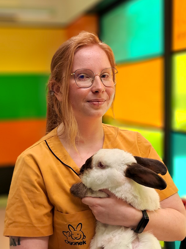 Skończyła studia weterynaryjne we Wrocławiu w 2023 roku. Jeszcze w ich trakcie zajęła ją tematyka królików i gryzoni. Praktyki studenckie odbyła między innymi u nas. Swoją karierę zawodową od początku związała z Ogonkiem. W tej chwili jest samodzielną lekarką, która cierpliwie i bardzo dokładnie tłumaczy swoim Klientom jak mają postępować ze swoimi pupilami. Bardzo uważnie studiuje przypadki i wyłapuje najmniejsze niuanse. Odważna, ucząca się na błędach, myśli i kombinuje by wymyślać i wspierać. Zainteresowana technikami USG - czy pójdzie w tę stronę?