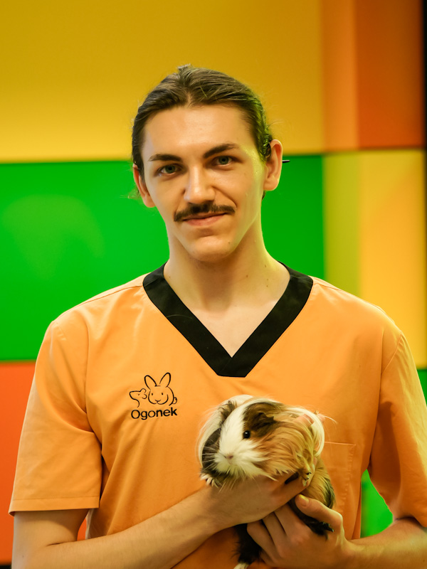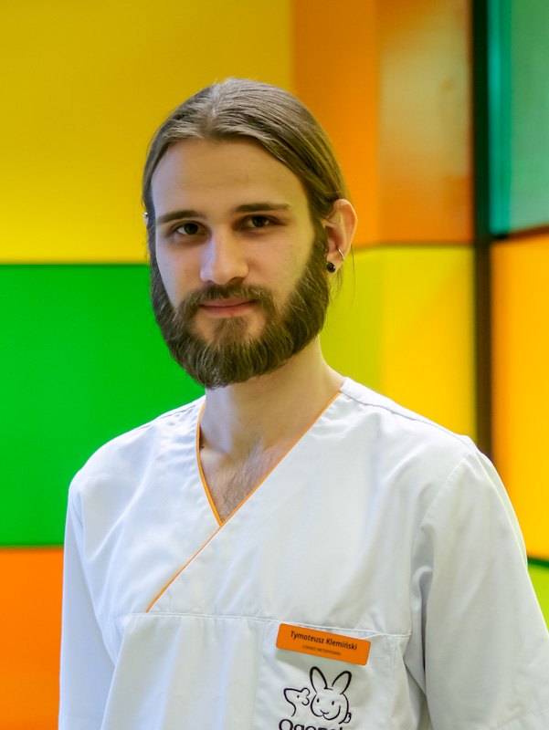 Ukończył studia weterynaryjne na warszawskiej SGGW w 2025 roku. Trafił do nas na praktyki wakacyjne. W tej chwili, od dłuższego czasu, jest nieocenioną pomocą lekarską jako asystent lekarzy weterynarii oraz sprawnym opiekunem zwierząt w szpitalu i w hotelu. Słowny, poukładany, spokojny, myślący racjonalnie i wyprzedzający potrzeby lekarzy. Cichy i na pozór nie wyróżniający się z tłumu, ale świetnie obserwujący otoczenie i umiejący wnieść ważny głos w dyskusje. Na jego dyżurach panuje ład i porządek. Szczerze zainteresowany medycyną zajęczaków i gryzoni oraz zwierząt dzikożyjących, zwłaszcza bobrów.